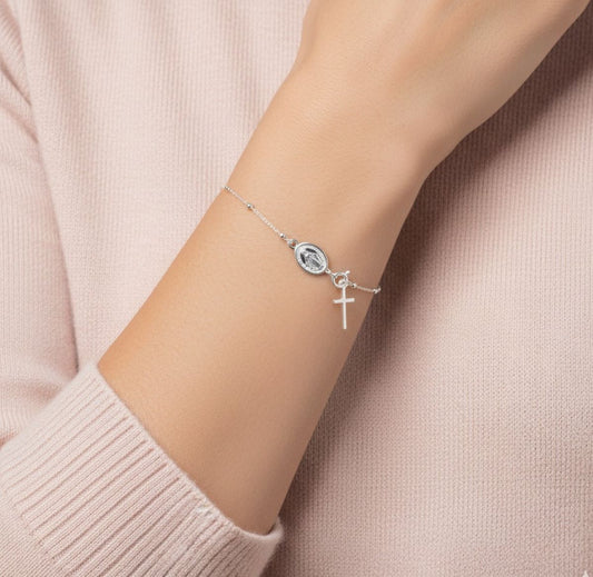 Pulsera Virgen de la Medalla Milagrosa y Cruces - Plata