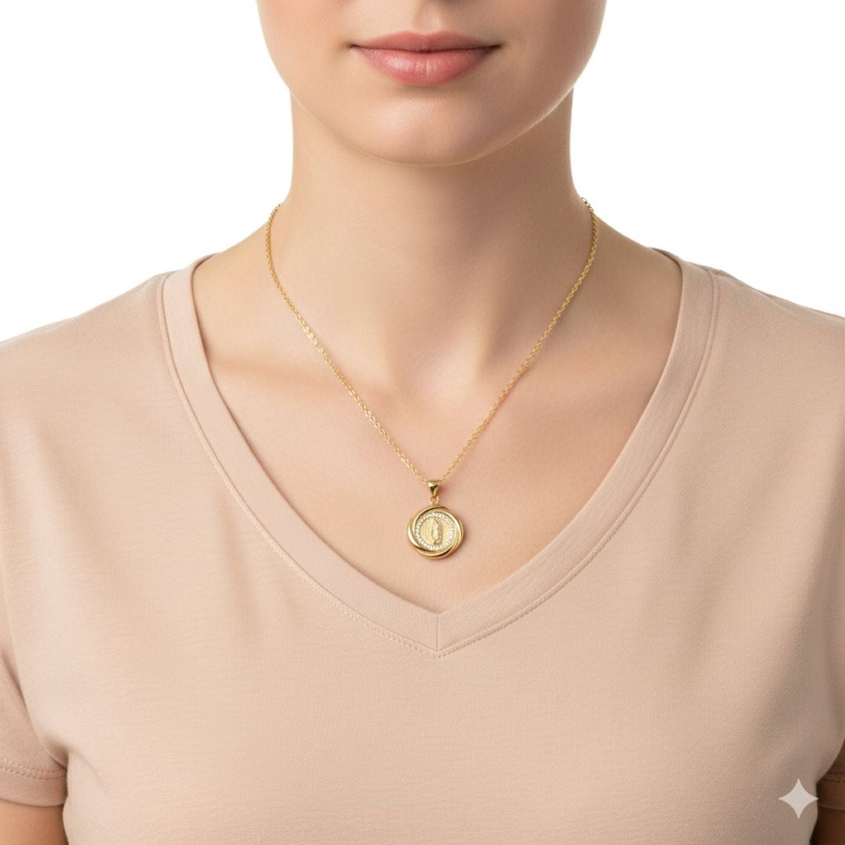 Diseño devocional: Dije redondo con la imagen de la Virgen de Guadalupe rodeada de circones brillantes.