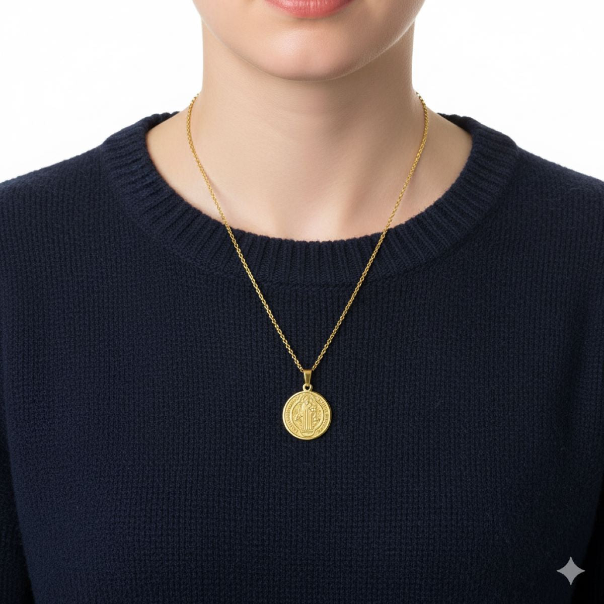 Lleva contigo la fuerza espiritual de San Benito con este conjunto de dije de 2.5 cm en acero y cadena de 50 cm, ideal para quienes buscan un símbolo de fe, protección y estilo duradero.
