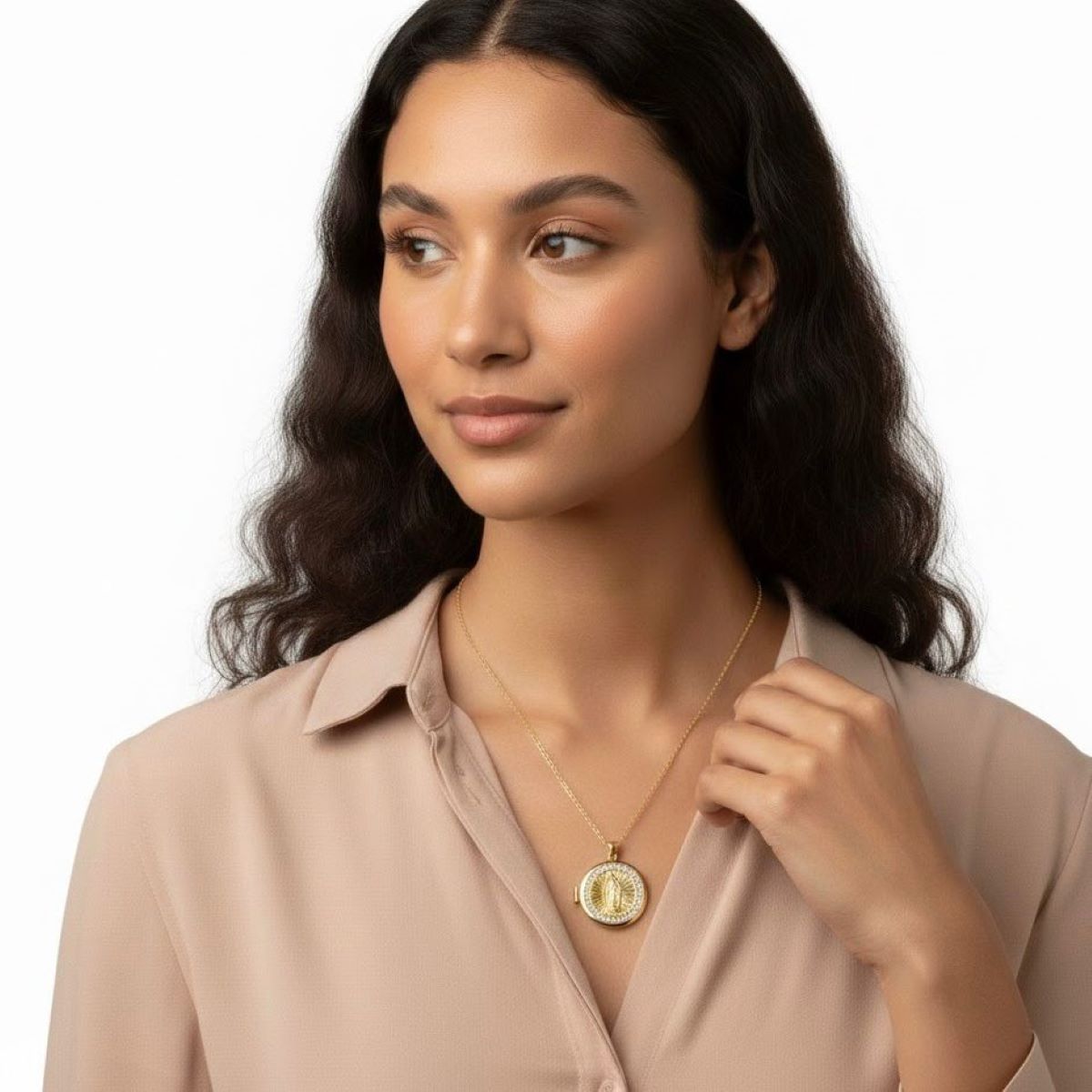 Una pieza ideal para quienes buscan relicario Virgen de Guadalupe, joyería religiosa en acero dorado y accesorios de fe con significado espiritual y estilo elegante.