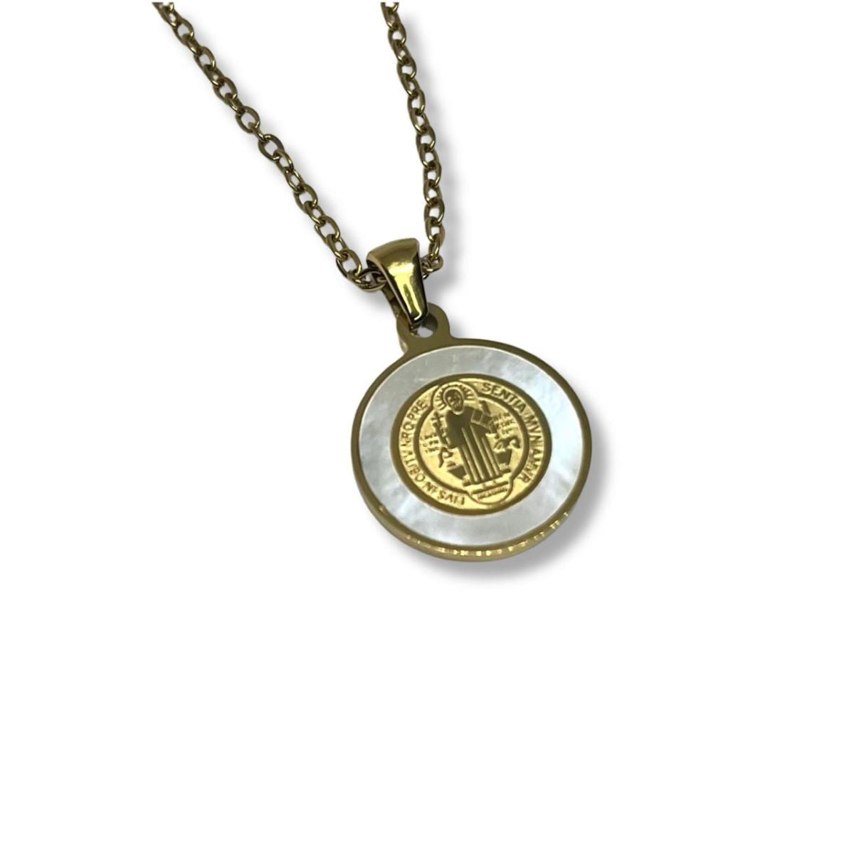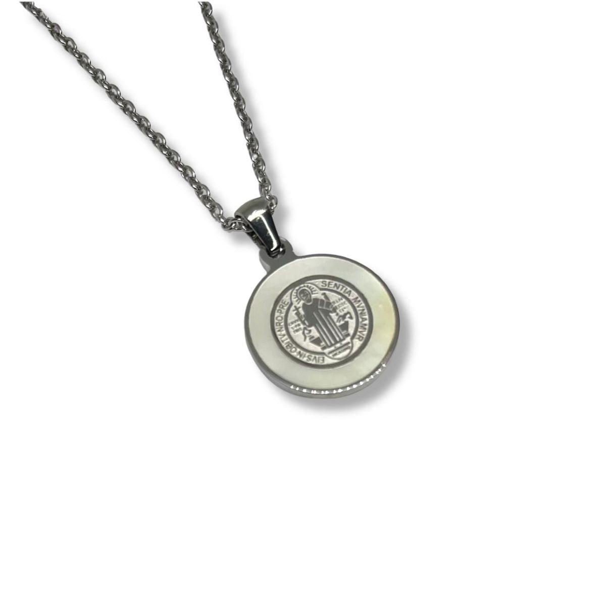 Dije de San Benito en Acero con Nácar – Protección y Estilo en una Pieza Espiritual