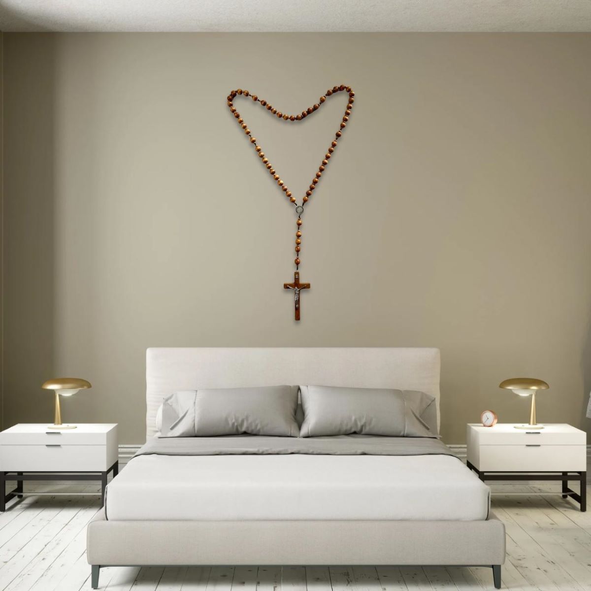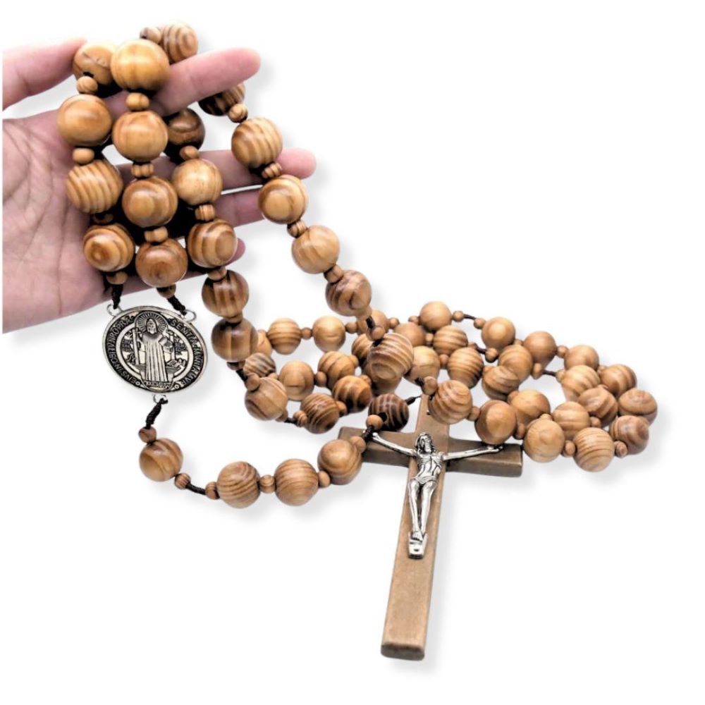 Este hermoso rosario de pared está elaborado en auténtica madera de olivo y cuenta con una medalla de San Benito, símbolo de protección espiritual. Ideal para colocar en la cabecera de la cama o en espacios de oración, combina fuerza simbólica y belleza natural.