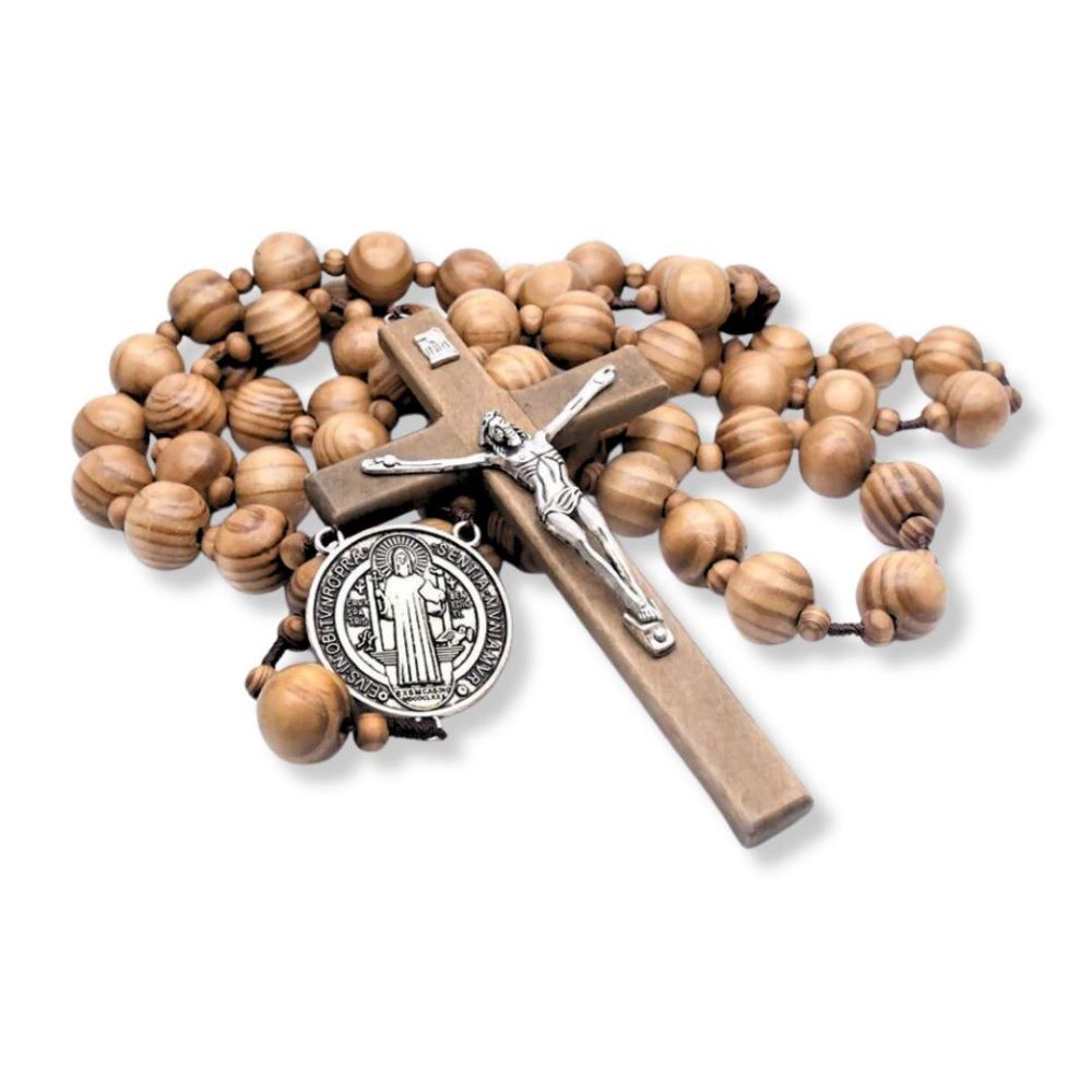 Rosario de Pared con Medalla de San Benito en Madera de Olivo – Protección y Devoción para el Hogar