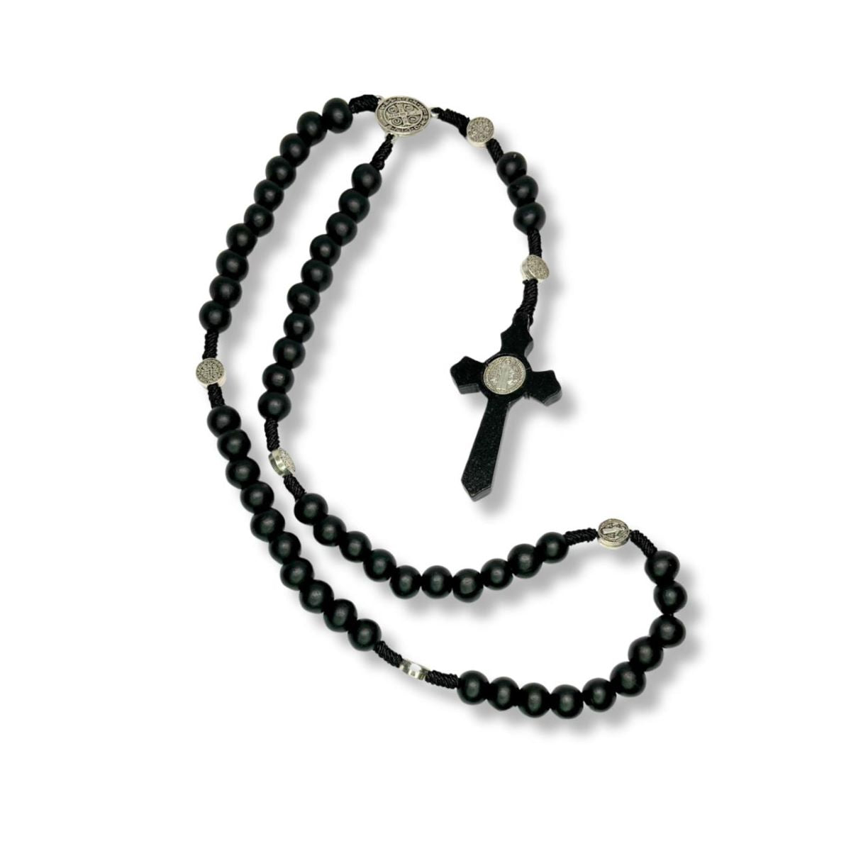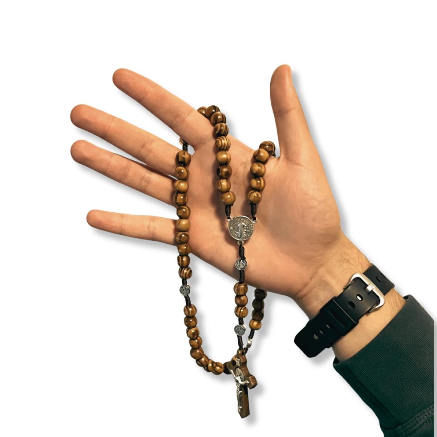 Este rosario está elaborado con cuentas auténticas de madera de olivo, símbolo de paz y fortaleza espiritual. Incluye una medalla de San Benito, reconocida por su poder protector, convirtiéndolo en una herramienta significativa para la oración diaria.